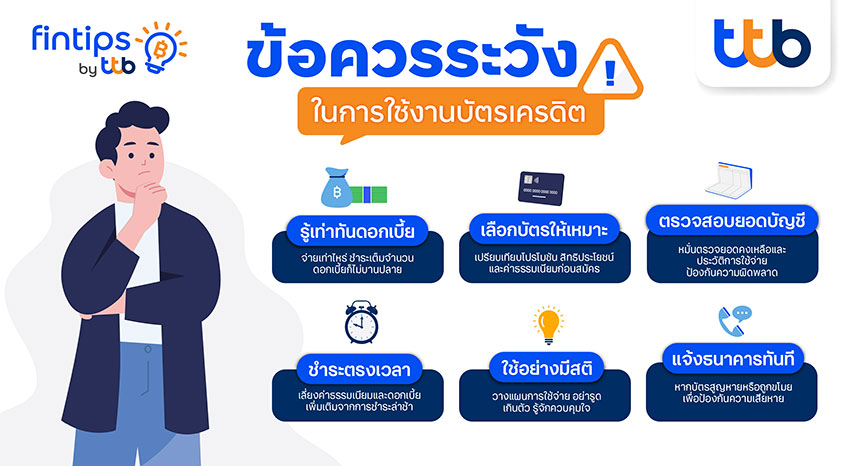 แม้บัตรเครดิตจะมีข้อดีและประโยชน์มากมาย แต่ก็มีข้อควรระวังในการใช้งาน ดังนี้