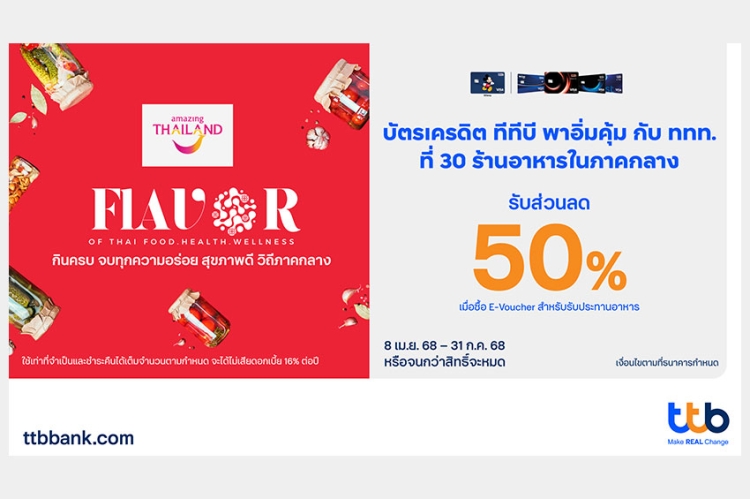 ทีเอ็มบีธนชาต หรือ ทีทีบี ร่วมกับ การท่องเที่ยวแห่งประเทศไทย (ททท.) ชวนผู้ถือบัตรเครดิต ทีทีบี บัตรเครดิต ทีทีบี โกลบอลเฮ้าส์ และบัตรเครดิต ทีทีบี ดิสนีย์ ทั้งบัตรหลักและบัตรเสริม ร่วมประสบการณ์แห่งการท่องเที่ยวเชิงวัฒนธรรมด้านอาหาร พร้อมดูแลสุขภาพ ผ่านแคมเปญ “กินครบ จบทุกความอร่อย สุขภาพดี วิถีภาคกลาง” มอบสิทธิพิเศษส่วนลด 50% เมื่อซื้อ E-voucher สำหรับรับประทานอาหาร ผ่านช่องทาง Line Official @flavorofthaifood และชำระผ่านบัตรเครดิต ทีทีบี โดย E-voucher มูลค่า 50 บาท สามารถใช้แทนเงินสดมูลค่า 100 บาท เพื่อรับประทานอาหารใน 30 ร้านอาหารชั้นนำจาก 17 จังหวัดภาคกลางที่ร่วมรายการ ไม่จำกัดจำนวนสิทธิ์การใช้ E-voucher ต่อครั้ง สามารถซื้อได้สูงสุด 20 สิทธิ์ / หมายเลขสมาชิกโครงการ / วัน ตั้งแต่วันนี้ - 31 กรกฎาคม 2568 หรือจนกว่าสิทธิ์จะหมด