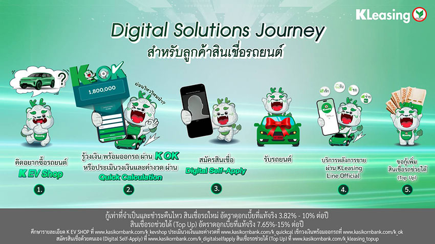 ทั้งนี้ ลูกค้าที่สนใจสามารถสมัครใช้บริการได้ที่เว็บไซต์ www.kasikornbank.com/k_ok หรือแอดไลน์ เพิ่มเพื่อน @kleasingofficial คลิกเมนู K OK