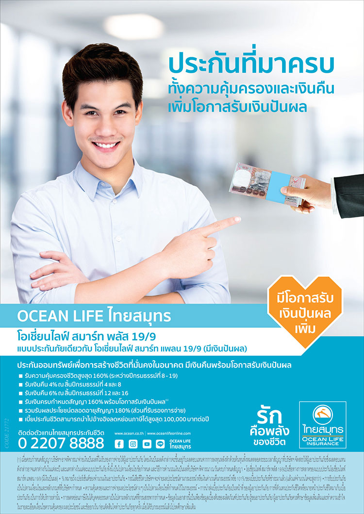 แนะทางเลือกใหม่ให้คุณเพิ่มความมั่นใจในการใช้ชีวิต ด้วยแบบประกันสะสมทรัพย์แบบมีเงินปันผลครั้งแรกจาก OCEAN LIFE ไทยสมุทร “โอเชี่ยนไลฟ์ สมาร์ท พลัส 19/9” แบบประกันที่ให้ความคุ้มครองชีวิตสูงสุด 160% ของจำนวนเงินเอาประกันภัย (ระหว่างปีกรมธรรม์ที่ 8 - 19) พร้อมรับเงินคืนระหว่างสัญญาทุก ๆ 4 ปี รับ 4% ของจำนวนเงินเอาประกันภัย ณ สิ้นปีกรมธรรม์ที่ 4 และ 8 และ 6% ของจำนวนเงินเอาประกันภัย ณ สิ้นปีกรมธรรม์ที่ 12 และ 16 โดยเมื่อครบกำหนดสัญญารับเงิน 160% ของจำนวนเงินเอาประกันภัย รวมรับผลประโยชน์ตลอดอายุสัญญา 180% ของจำนวนเงินเอาประกันภัย พร้อมโอกาสรับเงินปันผลเมื่อครบสัญญา โดยเงินปันผลดังกล่าวจะขึ้นอยู่กับผลตอบแทนจากการลงทุนตลอดระยะเวลาสัญญาที่บริษัทฯ จัดสรรให้ผู้เอาประกันภัย ซึ่งผลตอบแทนดังกล่าวอาจแตกต่างกันในแต่ละปี และแตกต่างในแต่ละแบบประกันภัย ทั้งนี้ เป็นไปตามเงื่อนไข ข้อกำหนด และวิธีการคำนวณเงินปันผลที่บริษัทฯ พิจารณา ณ วันครบกำหนดสัญญา