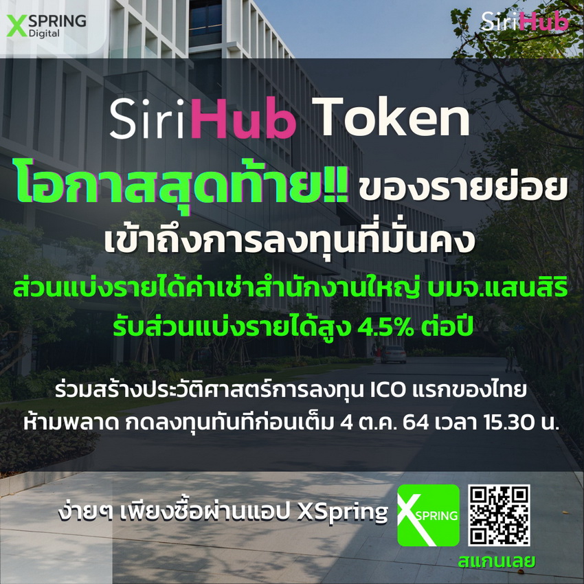 นักลงทุนที่สนใจโอกาสการลงทุนอย่างมั่นคงและปลอดภัยกับ ‘สิริฮับ โทเคน’ ซึ่งเป็นหนึ่งในการลงทุนเพียงไม่กี่โครงการในประเทศไทยที่เปิดโอกาสให้นักลุงทุนรายย่อยได้ร่วมเป็นส่วนหนึ่งของโครงการอสังหาริมทรัพย์ระดับพันล้าน บนทำเลศักยภาพ มีรายรับจากผู้เช่าที่มั่นคง และยังมีโอกาสได้รับส่วนแบ่งรายได้จากการประมูลขายทรัพย์สินเมื่อสิ้นสุดโครงการในปีที่ 4 หากไม่อยากพลาดโอกาสครั้งสำคัญกับการลงทุนใน ICO ครั้งประวัติศาสตร์ ยังเหลือเวลาในการทำรายการจองซื้อได้ภายในวันนี้ เวลา 15.30 น. เท่านั้น ผ่านแอปพลิเคชัน XSpring ทั้งระบบ iOS และ Android