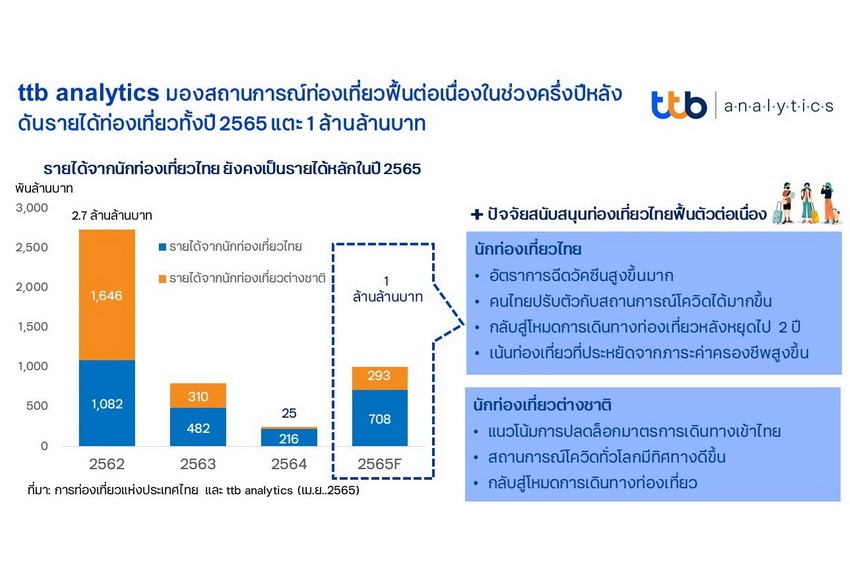 ซึ่งนำไปสู่รายได้จากนักท่องเที่ยวไทยและต่างชาติเพิ่มขึ้นกว่า 1.5 แสนล้านบาท แต่จากแรงกดดันด้านอัตราเงินเฟ้อซึ่งส่งผลให้ค่าครองชีพสูงขึ้น กอปรกับการกลับมาของนักท่องเที่ยวต่างชาติยังไม่ถึงระดับก่อนเกิดโควิด-19 โดยเฉพาะนักท่องเที่ยวจากจีนและรัสเซีย แม้ทยอยปลดล็อกมาตรการเดินทางเข้าประเทศแล้วก็ตาม อย่างไรก็ดี ศูนย์วิเคราะห์เศรษฐกิจ ทีทีบี หรือ ttb analytics ประเมินว่า ยังคงมีปัจจัยบวกที่หนุนการท่องเที่ยวไทยให้ฟื้นตัวต่อเนื่อง ดันรายได้นักท่องเที่ยวรวมทั้งปีเพิ่มขึ้นแตะ 1 ล้านล้านบาท หรือคิดเป็น 37%ของรายได้ปี 2562