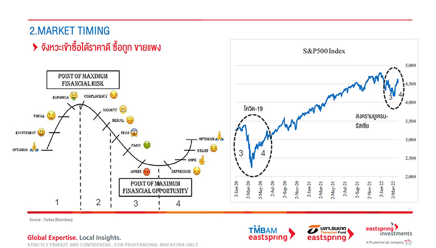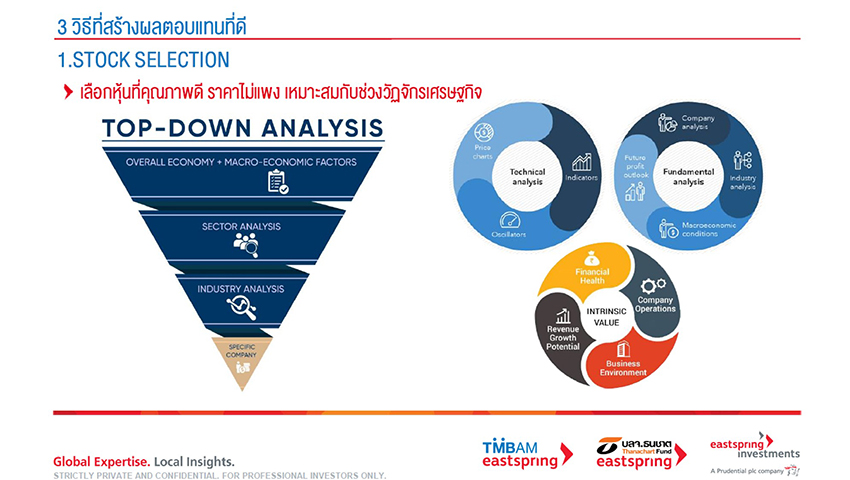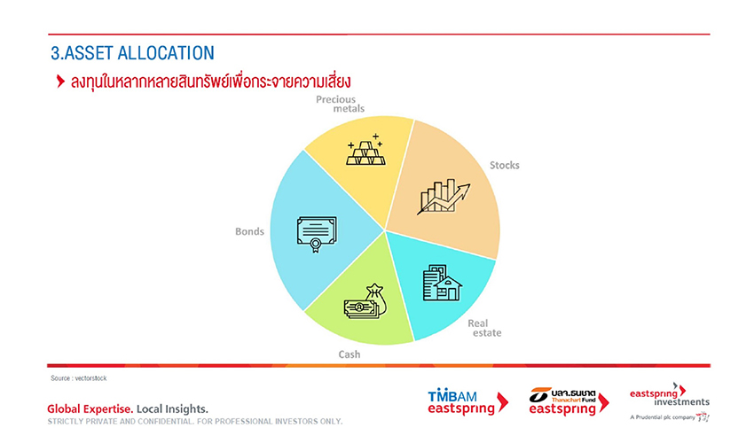 นายบดินทร์ พุทธอินทร์ ผู้อำนวยการส่วนกลยุทธ์การลงทุน TMBAM Eastspring กล่าวว่า 1 ล้านบาทแรกเป็นเป้าหมายที่ทุกคนอยากไปให้ถึง สำหรับผู้ที่เริ่มต้นวัยทำงานที่สนใจการลงทุน ควรมองหาผู้เชี่ยวชาญที่มีความรู้และมีประสบการณ์ จะช่วยให้สามารถบรรลุเป้าหมายได้เร็วขึ้น สิ่งที่สำคัญคือ การทำแบบประเมินความเสี่ยง เพื่อตรวจสอบตนเองว่าสามารถรับความเสี่ยงได้มากน้อยเพียงใด ซึ่งหลักการลงทุนมี 3 องค์ประกอบในการสร้างผลตอบแทนที่ดี ได้แก่ 1. Asset Allocation การลงทุนในหลากหลายสินทรัพย์เพื่อกระจายความเสี่ยงและความผันผวนที่จะเกิดขึ้น และจะเห็นประโยชน์ได้อย่างชัดเจนในช่วงที่ตลาดขาลง 2. Stock Selection การเลือกหุ้นที่คุณภาพดี ราคาไม่แพง เหมาะสมกับช่วงวัฏจักรเศรษฐกิจ และ 3. Market Timing การจับจังหวะ เข้าซื้อได้ราคาดี ซื้อถูกขายแพง