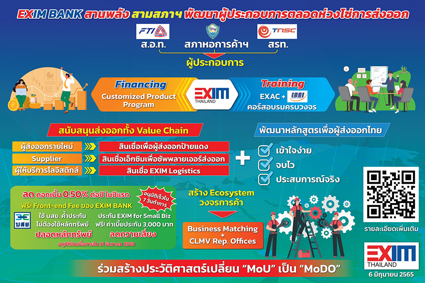 โครงการความร่วมมือสนับสนุนผู้ประกอบการตลอด Value Chain ของภาคการส่งออก ผู้ประกอบการไทยที่เป็นสมาชิกสภาหอฯ ส.อ.ท. และ สรท. สามารถสมัครขอรับบริการด้านสินเชื่อจาก EXIM BANK ได้ สำหรับผู้ที่ต้องการเริ่มต้นส่งออก ผู้ผลิตเพื่อผู้ส่งออก ผู้ให้บริการโลจิสติกส์ทางบก ทางเรือ หรือทางอากาศ อัตราดอกเบี้ยพิเศษต่ำสุด 4.5% ต่อปี (ลดดอกเบี้ยจากปกติลง 0.5% ต่อปี) ในปีแรก ฟรี! ค่าธรรมเนียม Front-end Fee โดยไม่ต้องใช้หลักทรัพย์ค้ำประกัน แถม! กรมธรรม์ประกันการส่งออก EXIM for Small Biz (ฟรี! เบี้ยประกัน 3,000 บาท) อนุมัติสินเชื่อเร็วภายใน 7 วันทำการ ทั้งนี้ ตั้งแต่บัดนี้ถึง 31 ธันวาคม 2565