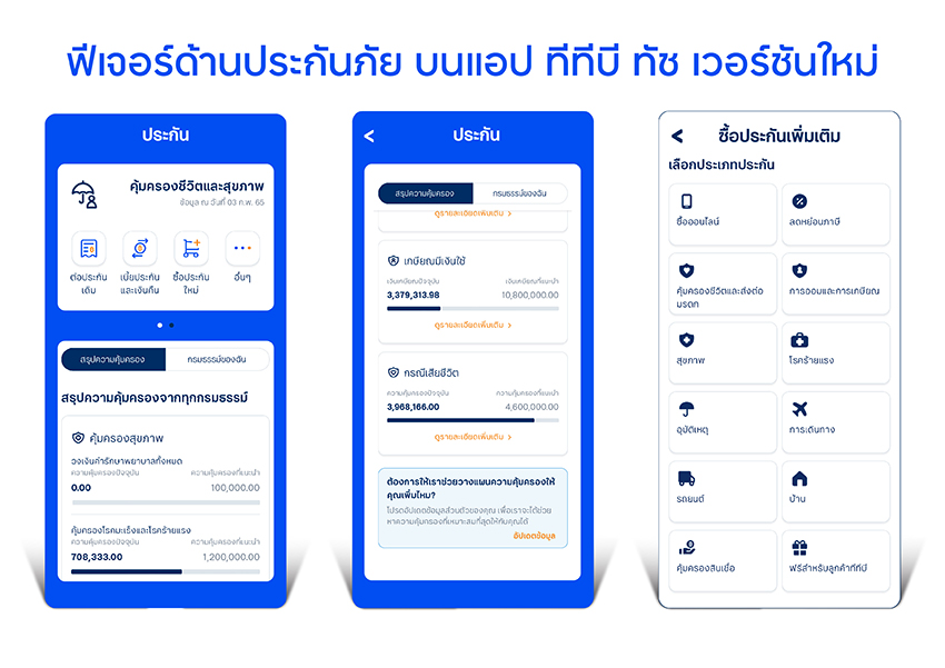 สำหรับจุดเด่นของฟีเจอร์ประกันบนแอป ttb touch เวอร์ชันใหม่ ลูกค้าจะได้เห็นภาพรวมของประกันในรูปแบบที่เข้าใจง่ายพร้อมคำแนะนำใน 3 ด้าน ได้แก่ คุ้มครองสุขภาพ เงินใช้หลังเกษียณ และกรณีเสียชีวิต โดยจะรวบรวมความคุ้มครองทั้งหมดที่ลูกค้ามีอยู่กับธนาคาร พร้อมคำแนะนำที่เหมาะสมจากการวิเคราะห์ข้อมูลลูกค้าแต่ละคนโดยเฉพาะ เพื่อให้ลูกค้าได้เห็นถึงความคุ้มครองที่ควรมีและแนะนำประกันที่พอดีกับตัวเอง รวมถึงสามารถปรับเปลี่ยนความคุ้มครองให้เหมาะกับอนาคตที่ต้องการได้โดยเข้าไปแก้ไขข้อมูลส่วนตัวให้ตรงตามเป้าหมายที่วางไว้ เพื่อให้ได้รับคำแนะนำที่ตอบโจทย์เฉพาะตัวลูกค้ามากที่สุด นอกจากนี้ ลูกค้าสามารถเช็กเบี้ยประกันที่ต้องชำระและเงินที่จะได้คืนตลอดอายุกรมธรรม์ ดูรายละเอียดกรมธรรม์หลัก ๆ ได้อย่างครบถ้วน ไม่ว่าจะเป็น วันเริ่มต้นและวันสิ้นสุดความคุ้มครอง ข้อมูลความคุ้มครอง ผู้รับผลประโยชน์ รายละเอียดการชำระเบี้ย ข้อมูลบริษัทประกันและหมายเลขติดต่อ