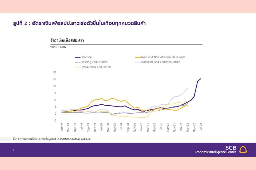 เงินกีบที่อ่อนค่าลงมากเป็นปัจจัยสำคัญที่ทำให้อัตราเงินเฟ้อในสปป.ลาวเร่งตัว และเกิดปัญหาการขาดแคลนสินค้าขึ้น ในเดือนกรกฎาคมอัตราเงินเฟ้อทั่วไปได้เร่งตัวขึ้นแตะ 25.6%YOY สูงสุดในรอบ 22 ปี (รูปที่ 2) โดยปรับเพิ่มขึ้นในเกือบทุกหมวดสินค้า เช่น ราคาน้ำมัน อาหาร และสาธารณูปโภค สาเหตุหลักมาจากราคาสินค้าโภคภัณฑ์ในตลาดโลกที่พุ่งสูงขึ้นหลังเกิดสงครามรัสเซีย-ยูเครนและปัญหาอุปทานคอขวดโลก ควบคู่กับการอ่อนค่าของเงินกีบซึ่งทำให้ราคาสินค้านำเข้าในสกุลเงินท้องถิ่นสูงขึ้นไปอีก นอกจากนี้ เมื่อมีความต้องการเงินสกุลต่างประเทศที่สูงขึ้นเพื่อนำเข้าสินค้า จึงเกิดปัญหาการขาดแคลนสกุลเงินต่างประเทศและการขาดแคลนสินค้าในที่สุด ซึ่งหนึ่งในสินค้าที่เกิดการขาดแคลนอย่างมากคือน้ำมัน โดยปั๊มน้ำมันหลายแห่งในสปป.ลาวได้เริ่มทยอยปิดให้บริการตั้งแต่ช่วงปลายปี 2021 เป็นต้นมา และสถานการณ์ได้แย่ลงต่อเนื่อง ล่าสุดปั๊มน้ำมันในกรุงเวียงจันทน์ได้เริ่มจำกัดโควตาการเติมน้ำมันแล้ว ทางการสปป.ลาวเผยว่า การขาดแคลนสกุลเงินต่างประเทศและจำนวนผู้นำเข้าน้ำมันที่น้อยลงหลังแบกรับภาระไม่ไหว ส่งผลให้สปป.ลาวนำเข้าน้ำมันได้เพียง 20 ล้านลิตร จากความต้องการต่อเดือน 120 ล้านลิตรซึ่งปัญหาการขาดแคลนน้ำมันได้ก่อให้เกิดการหยุดชะงักของกิจกรรมทางเศรษฐกิจในหลายภาคส่วน