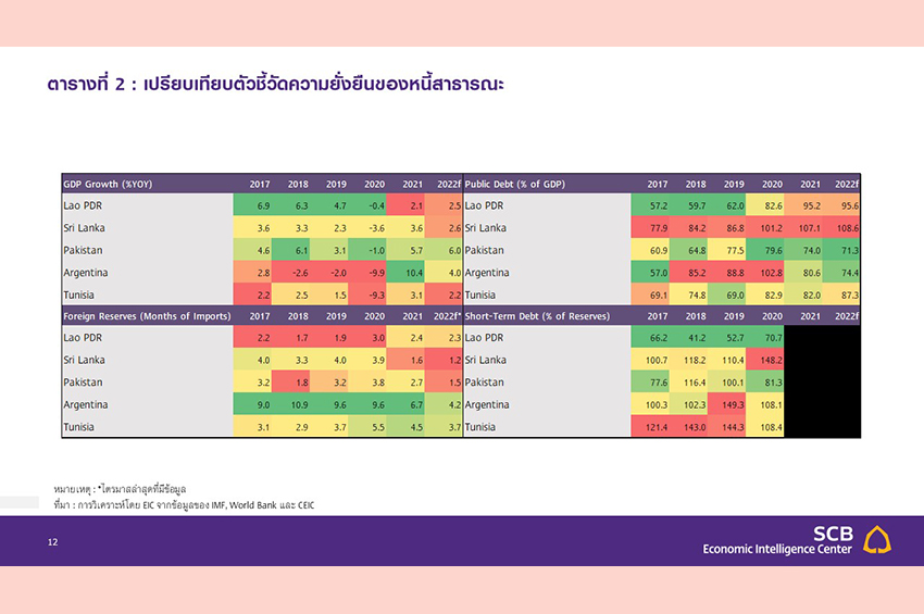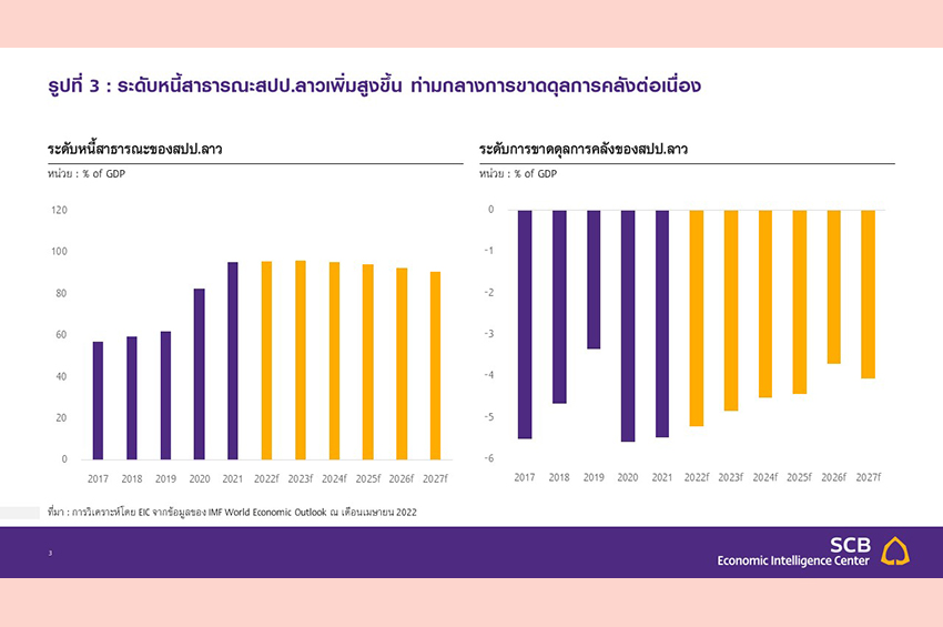 และช่องทางการระดมทุนที่มีจำกัดขึ้นหรือมีต้นทุนสูง จึงอาจทำให้ความเสี่ยงการผิดนัดชำระหนี้เพิ่มสูงขึ้น อย่างไรก็ตาม EIC คาดว่าสปป.ลาวจะได้รับความช่วยเหลือจากจีนบางส่วน และยังสามารถเข้าถึงช่องทางการระดมทุนได้บ้าง
