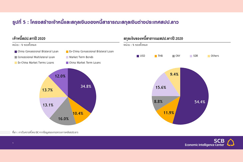 สาธารณะทั้งหมดของสปป.ลาว โดยส่วนใหญ่เป็นหนี้ในสกุลเงินดอลลาร์สหรัฐ ตามด้วยสิทธิพิเศษถอนเงิน (Special Drawing Rights: SDR หรือสกุลเงินที่ตั้งขึ้นมาโดย IMF และมีมูลค่าตามตะกร้าค่าเงินหลักของโลก) บาท และหยวน ตามลำดับ ขณะที่เจ้าหนี้หลักคือจีน ตามมาด้วยเจ้าหนี้พหุภาคี และไทย (รูปที่ 5)