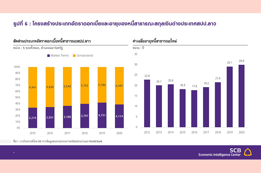สปป.ลาวได้พึ่งพาการกู้ยืมตามอัตราตลาด (Market terms) ที่สูงขึ้นเมื่อเทียบกับเงินกู้อัตราผ่อนปรน (Concessional loans) ในระยะหลัง จากสัดส่วน 33% ในปี 2015 เพิ่มขึ้นเป็นสัดส่วน 39% ในปี 2020 (รูปที่ 6 ซ้ายมือ) ซึ่งหนี้ Market terms นั้น จะมีอัตราดอกเบี้ยที่สูงกว่าและสามารถปรับโครงสร้างหนี้ได้ยากกว่า จึงเป็นความเสี่ยงต่อการชำระหนี้ในภาวะดอกเบี้ยขาขึ้น นอกจากนี้ อีกสองปัจจัยเสี่ยงสำคัญต่อการชำระหนี้คืออัตราส่วนหนี้ที่มีอัตราดอกเบี้ยผันแปร (Variable rate) ซึ่งจะมีความอ่อนไหวต่ออัตราดอกเบี้ยที่สูงขึ้นในตลาด เทียบกับอัตราดอกเบี้ยคงที่ (Fixed rate) และระยะเวลาถึงวันครบกำหนดชำระหนี้ (Maturity) ซึ่งหากมีระยะสั้นก็จะเป็นความเสี่ยงต่อการชำระหนี้ อย่างไรก็ดี สปป.ลาวยังสามารถบริหารความเสี่ยงสองประเด็นนี้ได้ โดยมีอัตราส่วนหนี้ดอกเบี้ยผันแปรในปี 2020 ที่ 17.4% และมีค่าเฉลี่ยระยะเวลาก่อนถึงวันครบกำหนดที่ประมาณ 22 ปีสำหรับหนี้ใหม่ระหว่างปี 2012-2020 (อ้างอิงข้อมูลจาก World bank) (รูปที่ 6)