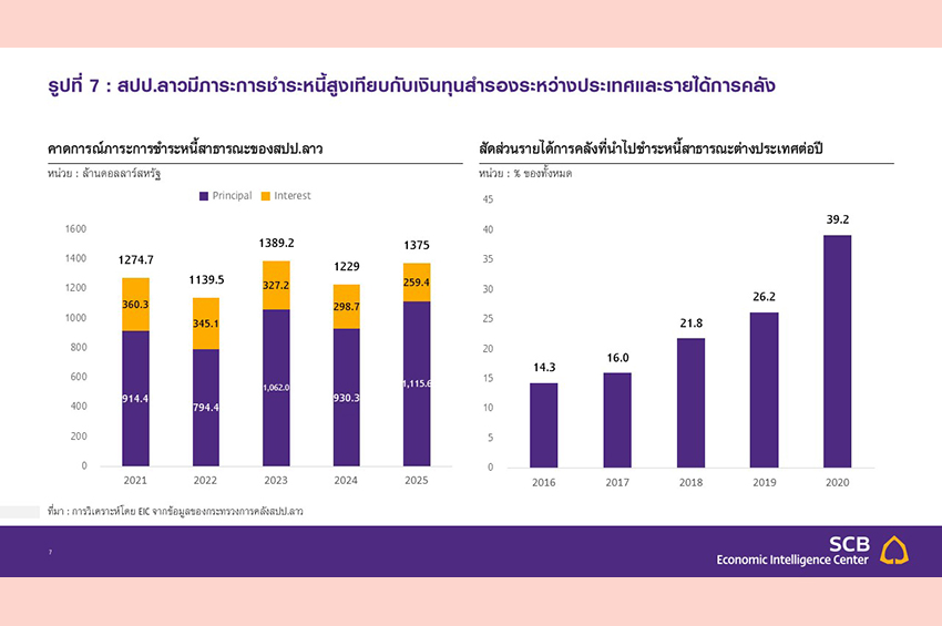 จากปัจจุบันจนถึงปี 2025 สปป.ลาวจะมีภาระการชำระหนี้เกินปีละ 1 พันล้านดอลลาร์สหรัฐ ซึ่งค่อนข้างสูงเมื่อเทียบกับระดับเงินทุนสำรองระหว่างประเทศ ขณะที่สัดส่วนรายได้ภาครัฐที่นำไปชำระหนี้เพิ่มสูงขึ้นต่อเนื่อง (รูปที่ 7)