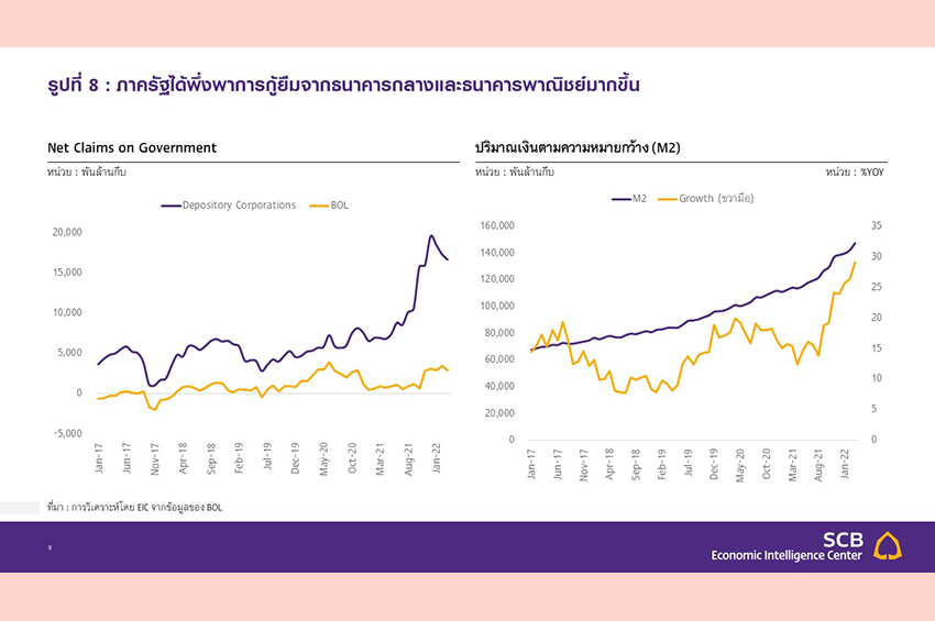 หลังช่องทางการระดมทุนในตลาดต่างประเทศมีจำกัดสปป.ลาวหันมาพึ่งพาการกู้ยืมจากธนาคารพาณิชย์ในประเทศและธนาคารกลางมากขึ้น (Monetary financing) ซึ่งเป็นหนึ่งปัจจัยที่ทำให้อัตราเงินเฟ้อเร่งตัวขึ้นและค่าเงินอ่อนลง สะท้อนจากมูลค่าสินเชื่อให้รัฐบาลสุทธิ (Net credit to government) ของธนาคารพาณิชย์และสิทธิเรียกร้องจากรัฐบาลสุทธิ (Net claims on government) ของธนาคารกลางที่เพิ่มสูงขึ้นอย่างรวดเร็วในปี 2021 การระดมทุนช่องทางนี้แม้จะมีข้อดีจากการไม่เพิ่มการขาดดุลการคลัง แต่จะมีความเสี่ยงในด้านการเพิ่มปริมาณเงิน (Money supply) ในระบบ (รูปที่ 8) ซึ่งนำไปสู่อัตราเงินเฟ้อที่สูงขึ้นและค่าเงินที่อ่อนลง นอกจากนี้ หากรัฐบาลเผชิญปัญหา