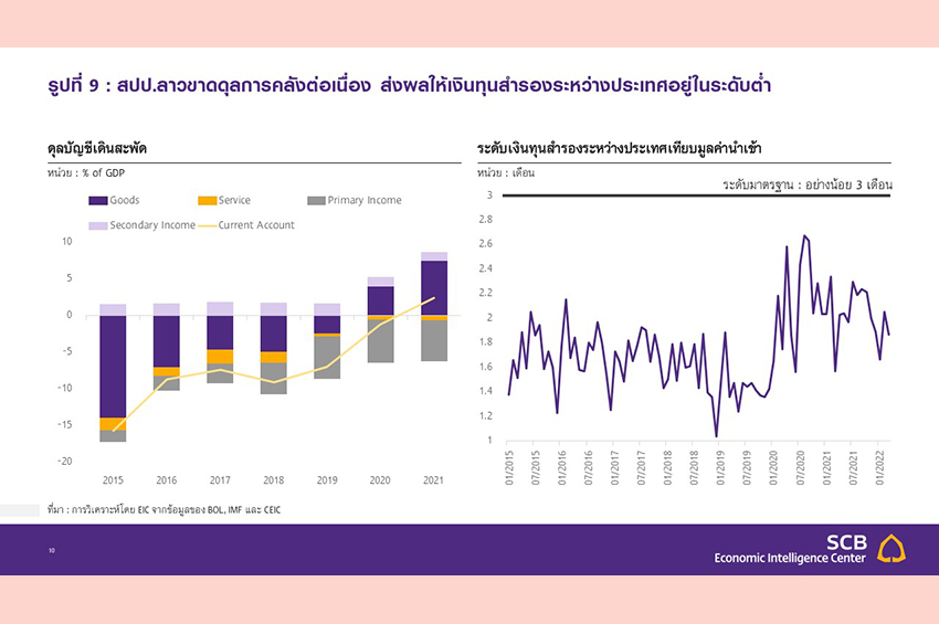 จากข้อมูลล่าสุด ระดับเงินทุนสำรองระหว่างประเทศของสปป.ลาว ณ เดือนมีนาคม 2022 อยู่ที่ 1.29 พันล้านดอลลาร์สหรัฐ เทียบการคาดการณ์ภาระการชำระหนี้ 1.14 พันล้านดอลลาร์สหรัฐในปีนี้ (การคาดการณ์จัดทำในปี 2020 โดยกระทรวงการคลังสปป.ลาว) และเทียบเท่ามูลค่าการนำเข้าเพียง 1.9 เดือน (ค่ามาตรฐานอยู่ที่ 3 เดือน) ทั้งนี้มูลค่าเงินทุนฯ 1.29 พันล้านดอลลาร์สหรัฐนี้ ได้รวมการทำธุรกรรมแลกเปลี่ยนเงินตราต่างประเทศ (Currency swap agreement) กับธนาคารกลางจีนประมาณ 300 ล้านดอลลาร์สหรัฐไปแล้ว ซึ่งจำนวนนี้ตั้งไว้เพื่อการนำเข้าสินค้าจากจีนเท่านั้นและไม่สามารถนำไปชำระหนี้ได้ จึงทำให้เงินทุนฯ ที่แท้จริงต่ำกว่าตัวเลขที่รายงาน ขณะเดียวกัน ด้วยระดับหนี้สาธารณะที่สูงขึ้นต่อเนื่อง ประกอบกับการจัดเก็บรายได้ภาครัฐที่ทรงตัว ทำให้สัดส่วนรายได้ภาครัฐที่นำไปชำระหนี้เพิ่มขึ้นแตะระดับ 39% ในปี 2020 จากเพียง 14.3% ในปี 2016 และเป็นความเสี่ยงต่อความสามารถการชำระหนี้ต่อไป