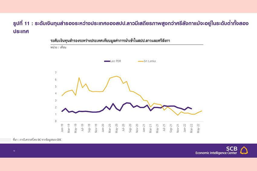 ที่เพิ่มขึ้น โดยสปป.ลาวมีค่าคาดการณ์อยู่ที่ 229.4 และ 246.8 ในปี 2022 และ 2023 ตามลำดับ ขณะที่ศรีลังกามีค่าอยู่ที่ 503.4 และ 567.4 ตามลำดับ สะท้อนถึงความเปราะบางที่สูงกว่ามาก ซึ่งปัจจัยหลักมาจากระดับเงินทุนสำรองระหว่างประเทศที่ลดลงอย่างรวดเร็ว (รูปที่ 11)