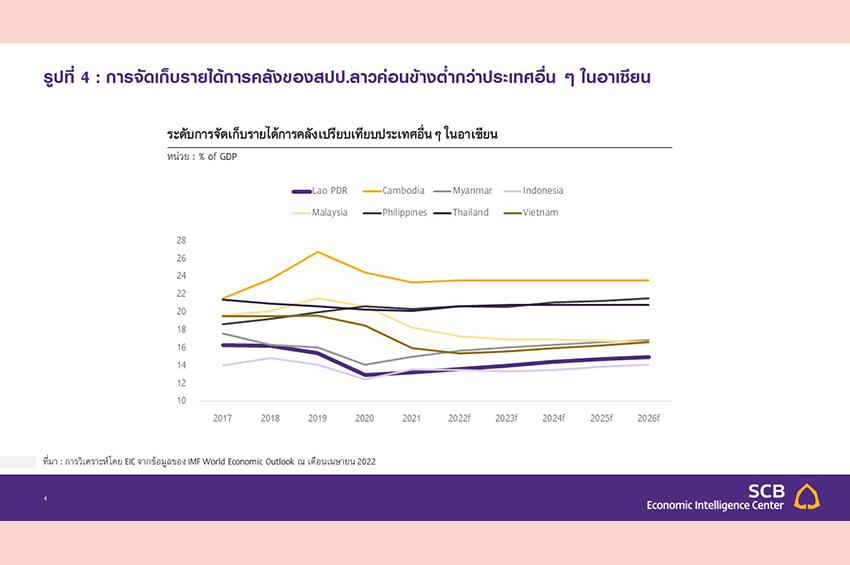 การลงทุนในโครงสร้างพื้นฐานเหล่านี้แม้จะเป็นปัจจัยที่ช่วยผลักดันเศรษฐกิจสปป.ลาว แต่ในระยะสั้นยังไม่ได้ให้ผลตอบแทนที่คุ้มค่าต่อเศรษฐกิจสปป.ลาวในภาพรวม สะท้อนจากอัตราการเติบโตทางเศรษฐกิจที่ชะลอตัวตั้งแต่ปี 2013 เป็นต้นมา โดยหลายโครงการยังไม่สามารถทำกำไรได้ และยังประสบปัญหาในระยะที่ผ่านมา เช่น ภัยแล้งและอุทกภัยที่ส่งผลกระทบต่อภาคการเกษตรและโรงไฟฟ้าพลังงานน้ำ และเหตุการณ์เขื่อนแตกในปี 2018 ที่นำไปสู่การหยุดการก่อสร้างเขื่อนชั่วคราว นอกจากนี้ การลงทุนในโครงสร้างพื้นฐานเหล่านี้ยังไม่สามารถดึงดูดการลงทุนโดยตรงจากต่างประเทศในภาคเศรษฐกิจอื่น ๆ ได้มากเท่าที่ควร ขณะเดียวกัน การจัดเก็บรายได้ภาครัฐต่อ GDP มีแนวโน้มลดลง (รูปที่ 4) โดยเมื่อเปรียบเทียบกับประเทศอื่น ๆ ในอาเซียน พบว่าการจัดเก็บรายได้ของสปป.ลาวเทียบต่อ GDP อยู่ในระดับค่อนข้างต่ำอยู่แล้ว ซึ่งส่วนหนึ่งเป็นผลจากเศรษฐกิจนอกระบบ (Informal economy) ที่มีขนาดใหญ่และระบบการจัดเก็บภาษีที่ไม่คลอบคลุมเพียงพอ