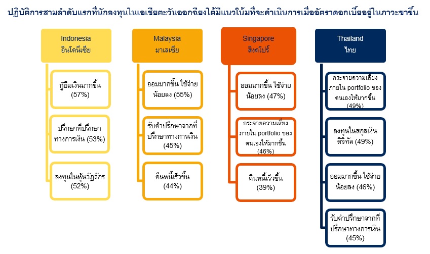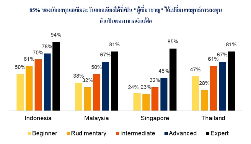 เป็นที่น่าสนใจว่า นักลงทุนไทยที่จัดให้ความรู้เรื่องการลงทุนของตนเองเป็นระดับ ‘ผู้เชี่ยวชาญ’ จำนวน 81% (เทียบกับ 85% ในเอเชียตะวันออกเฉียงใต้ และ 80% ทั่วโลก) ระบุว่า พวกเขาได้เปลี่ยนกลยุทธ์การลงทุนเพื่อให้สอดคล้องต่อสภาวะอัตราเงินเฟ้อที่เพิ่มสูงขึ้น ทั้งนี้ เมื่อเทียบกับนักลงทุนไทยทั่วไปโดยเฉลี่ยจำนวน 64% (เทียบกับ 60% ในเอเชียตะวันออกเฉียงใต้ และ 55% ทั่วโลก)