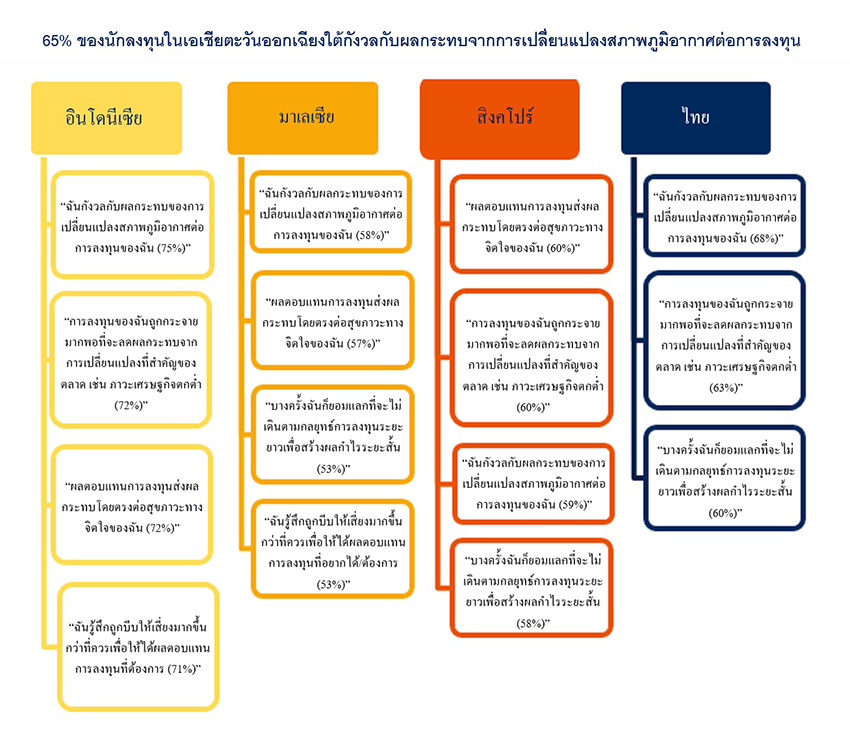 นอกเหนือจากนั้น นักลงทุนไทยจำนวน 68% (เทียบกับ 65% ในเอเชียตะวันออกเฉียงใต้ และ 61% ทั่วโลก) ยังวิตกกังวลกับผลกระทบจากการเปลี่ยนแปลงสภาพภูมิอากาศที่อาจส่งผลต่อการลงทุนของเขา