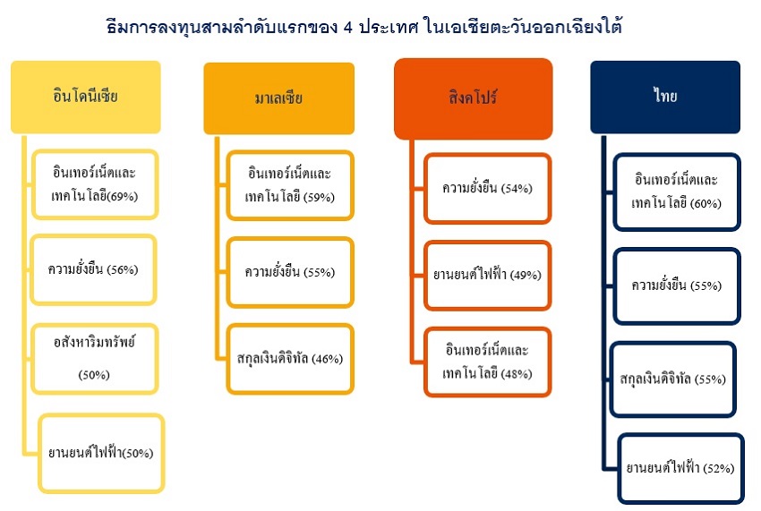 การมองหาธีมการลงทุนกำลังเติบโตขึ้นในหมู่นักลงทุนทั้งหลาย โดยนักลงทุนไทยจำนวน 60% (เทียบกับ 58% ในเอเชียตะวันออกเฉียงใต้ และ 57% ทั่วโลก) กระตือรือร้นที่จะจัดสรรการลงทุนในกลุ่มเทคโนโลยี ในทำนองเดียวกัน ความยั่งยืนก็ยังคงเป็นธีมการลงทุนที่สำคัญ โดยมีนักลงทุนในประเทศไทยจำนวน 55% (เทียบกับ 54% ในเอเชียตะวันออกเฉียงใต้ และ 52% ทั่วโลก) ให้ความสนใจในธีมการลงทุนแบบยั่งยืน นอกจากนั้น จำนวน 55% (เทียบกับ 47% ในเอเชียตะวันออกเฉียงใต้ และทั่วโลก) เลือกการลงทุนในคริปโตเคอเรนซี่