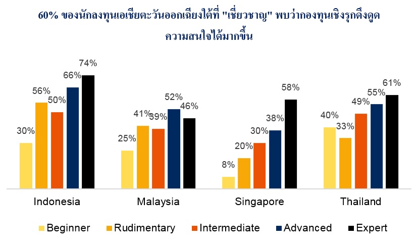 นอกจากนี้ นักลงทุนที่ระบุว่าตนเองมีความชำนาญในการลงทุน ก็ มีแนวโน้มที่จะหันไปหาผู้จัดการกองทุนที่เชี่ยวชาญเชิงรุกมากกว่าเมื่อ 6 เดือนที่แล้ว เช่น นักลงทุนมืออาชีพ ในประเทศไทย จำนวน 61% % (เทียบกับ 60% ในเอเชียตะวันออกเฉียงใต้ และ 63% ทั่วโลก) และนักลงทุนที่มองว่าตัวเองมีความชำนาญสูงจำนวน 55% % (เทียบกับ 53% ในเอเชียตะวันออกเฉียงใต้ และ 51% ทั่วโลก) เห็นว่ากองทุนเชิงรุกดึงดูดความสนใจได้มากกว่า