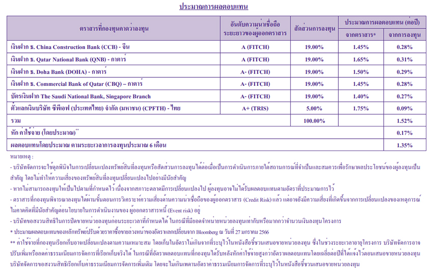 สำหรับสินทรัพย์ที่คาดว่ากองทุนจะลงทุน ได้แก่ เงินฝากธนาคาร China Construction Bank, เงินฝากธนาคาร Qatar National Bank, เงินฝากธนาคาร Doha Bank, เงินฝากธนาคาร Commercial Bank of Qatar, บัตรเงินฝาก The Saudi National Bank, Singapore Branch และตั๋วแลกเงินบริษัท ซีพีเอฟ (ประเทศไทย) จำกัด (มหาชน) โดยคาดว่าผลตอบแทนอยู่ที่ประมาณ 1.35% ต่อปี