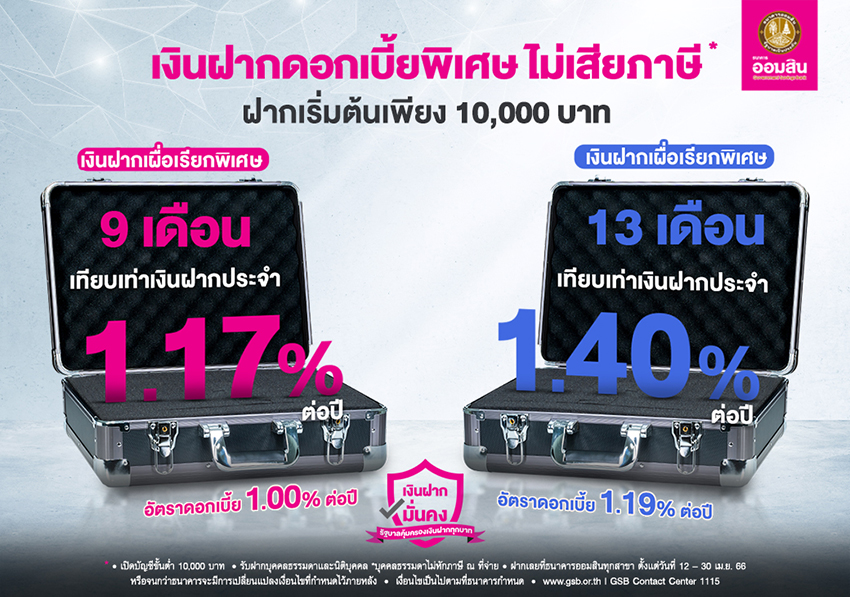 ทั้งนี้ เพื่อกระตุ้นให้เกิดการออมอย่างต่อเนื่อง และประชาชนได้รับประโยชน์ในช่วงดอกเบี้ยขาขึ้น ธนาคารจึงได้เปิดตัวเงินฝากเงื่อนไขพิเศษอีก 2 ประเภท ได้แก่ เงินฝากเผื่อเรียกพิเศษ 9 เดือน มีระยะเวลาฝาก 9 เดือน อัตราดอกเบี้ย 1.00% ต่อปี (เทียบเท่าเงินฝากประจำ 1.17% ต่อปี) และ เงินฝากเผื่อเรียกพิเศษ 13 เดือน ระยะเวลาฝาก 13 เดือน อัตราดอกเบี้ย 1.19% ต่อปี (เทียบเท่าเงินฝากประจำ 1.40% ต่อปี) เปิดรับฝากทั้งบุคคลธรรมดาและนิติบุคคลทุกประเภท เริ่มต้นฝาก 10,000 บาท ฝากเพิ่มครั้งละไม่ต่ำกว่า 1,000 บาท ไม่จำกัดวงเงินรับฝากสูงสุดและบุคคลธรรมดาได้รับดอกเบี้ยไม่ถูกหักภาษี เปิดรับฝากตั้งแต่วันที่ 12-30 เม.ย.2566 ที่ธนาคารออมสินทุกสาขาทั่วประเทศ