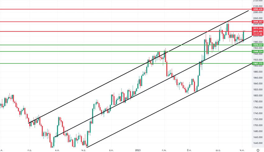 อย่างไรก็ตามหากวิเคราะห์แนวโน้มราคาทองคำในมุมทางเทคนิค พบว่าแนวโน้มราคาทองคำคาดอยู่ในช่วงของการปรับฐาน ราคาทองคำพยายามสร้างฐานที่ 1,970-1,980 usd/oz ถ้าหลุดแนวรับดังกล่าว ซึ่งจะอยู่บริเวณกรอบล่างของเส้นเทรนด์ไลน์คาดว่าจะมีแรงเทขายออกมามากและจะเข้าสู่แนวโน้มขาลง