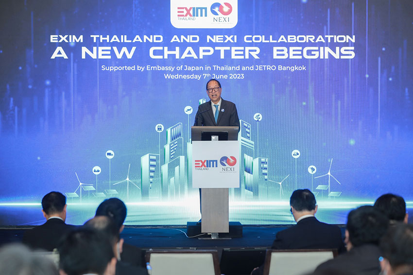 ดร.พสุ โลหารชุน ประธานกรรมการ ธนาคารเพื่อการส่งออกและนำเข้าแห่งประเทศไทย (EXIM BANK) พร้อมด้วยนายโอบะ ยูอิจิ อุปทูตรักษาสถานเอกอัครราชทูตญี่ปุ่นประจำประเทศไทย เป็นประธานในพิธีเปิดงานสัมมนา “EXIM Thailand and NEXI Collaboration: A New Chapter Begins” จัดโดย EXIM BANK ร่วมกับองค์กรรับประกันแห่งประเทศญี่ปุ่น (Nippon Export and Investment Insurance : NEXI) เพื่อสนับสนุนความรู้ โอกาส และเครื่องมือทางการเงินทั้งสินเชื่อและเครื่องมือป้องกันความเสี่ยง โดยมีผู้ประกอบการไทยและญี่ปุ่นจำนวนกว่า 100 คน เข้าร่วมงาน ทั้งสองหน่วยงานจะร่วมกันสนับสนุนให้ผู้ประกอบการไทยและญี่ปุ่นเข้าถึงโอกาสใหม่ ๆ ด้านการค้าและการลงทุนในกลุ่มประเทศลุ่มแม่น้ำโขง โดยมี ดร.รักษ์ วรกิจโภคาทร กรรมการผู้จัดการ EXIM BANK นายนฤตม์ เทอดสถีรศักดิ์ เลขาธิการคณะกรรมการส่งเสริมการลงทุน (BOI) และนางอารดา เฟื่องทอง รองอธิบดีกรมส่งเสริมการค้าระหว่างประเทศ กระทรวงพาณิชย์ ร่วมเป็นวิทยากร ณ โรงแรมคาเพลลา กรุงเทพ เมื่อวันที่ 7 มิถุนายน 2566