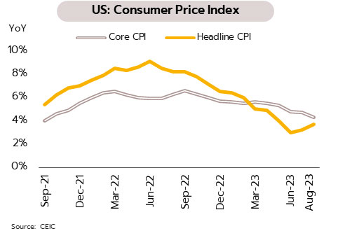 แม้ตัวเลขเงินเฟ้อเดือนสิงหาคมสูงกว่าคาด แต่แนวโน้มการชะลอตัวของเศรษฐกิจคาดหนุนเฟดคงอัตราดอกเบี้ยในการประชุมช่วงที่เหลือของปีนี้ ในเดือนสิงหาคม อัตราเงินเฟ้อทั่วไปเพิ่มขึ้น 3.7% YoY และ 0.6% MoM เร่งตัวขึ้นจากเดือนก่อนที่ 3.2% และ 0.2% ตามลำดับ แต่อัตราเงินเฟ้อพื้นฐานชะลอลงสู่ 4.3% YoY จากเดือนก่อนที่ 4.7% หากไม่รวมหมวดที่พักอาศัยอัตราเงินเฟ้อพื้นฐานชะลอลงสู่ 2.2% ด้านผู้บริโภคคาดว่าเงินเฟ้อในช่วง 1 ปีข้างหน้าจะอยู่ที่ 3.1% ซึ่งต่ำสุดนับตั้งแต่เดือนมีนาคม 2564 ขณะที่ยอดค้าปลีกขยายตัวที่ 0.6% MoM สูงกว่าคาดการณ์ของตลาดที่ 0.2% และเพิ่มขึ้นจากเดือนก่อนที่ 0.5% ส่วนใหญ่เป็นผลจากการเพิ่มขึ้นของราคาพลังงาน ด้านความเชื่อมั่นผู้บริโภคลดลงในเดือนกันยายนและต่ำกว่าที่ตลาดคาดการณ์