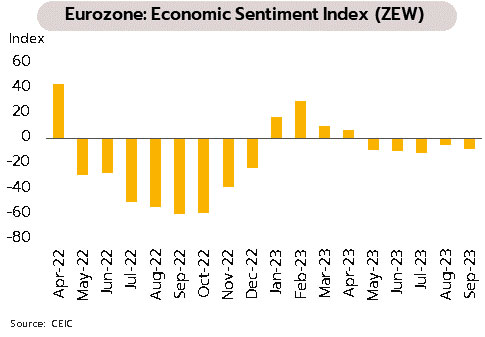 ความเสี่ยง recession ยังสูงในครึ่งปีหลัง ขณะที่การปรับขึ้นอัตราดอกเบี้ยของ ECB ในเดือนกันยายนคาดว่าจะเป็นครั้งสุดท้าย ในเดือนกรกฎาคม ผลผลิตภาคอุตสาหกรรมอยู่ที่ -2.2% YoY และ -1.1% MoM หดตัวแรงมากขึ้นเมื่อเทียบกับเดือนก่อนที่ -1.1% และ -0.4% ตามลำดับ ขณะที่ในเดือนกันยายน ดัชนีความเชื่อมั่นทางเศรษฐกิจ (ZEW) อยู่ที่ -8.9 หดตัวมากขึ้นจากเดือนก่อนที่ -5.5 สำหรับการประชุมนโยบายการเงินของธนาคารกลางยุโรป (ECB) มีมติปรับขึ้นอัตราดอกเบี้ย 0.25% ส่งผลให้อัตราดอกเบี้ยเงินฝากเพิ่มขึ้นสู่ระดับ 4.0% ขณะที่อัตราดอกเบี้ยเงินกู้อยู่ที่ระดับ 4.75% ส่วนอัตราดอกเบี้ยรีไฟแนนซ์อยู่ที่ระดับ 4.50%