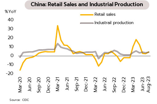 เครื่องชี้ด้านการบริโภคและการผลิตภาคอุตสาหกรรมกระเตื้องขึ้นหลังจีนออกมาตรการพยุงเศรษฐกิจ ขณะที่วิกฤตภาคอสังหาฯยังฉุดการลงทุน ในเดือนสิงหาคม ยอดค้าปลีกเติบโตเร่งขึ้นสู่ 4.6% YoY จาก 2.5% ในเดือนกรกฎาคม ส่วนหนี่งเป็นผลจากการใช้จ่ายในฤดูท่องเที่ยวช่วงหน้าร้อน ด้านการผลิตภาคอุตสาหกรรมขยายตัวดีขึ้นสู่ 4.5% จาก 3.7% ขณะเดียวกันอัตราการว่างงานในพื้นที่เขตเมืองลดลงเล็กน้อยสู่ 5.2% จาก 5.3% อย่างไรก็ตาม การลงทุนในสินทรัพย์ถาวรขยายตัวเพียง 3.2% ในช่วง 8 เดือนแรกของปี ชะลอลงเล็กน้อยจากเติบโต 3.3% ในช่วง 7 เดือนแรก ปัจจัยกดดันจากการทรุดตัวของการลงทุนในภาคอสังหาริมทรัพย์