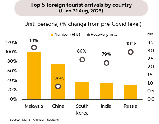 ข้อมูลล่าสุดจากกองเศรษฐกิจการท่องเที่ยวและกีฬารายงานตั้งแต่วันที่ 1 มกราคม ถึงวันที่ 10 กันยายน มีจำนวนนักท่องเที่ยวต่างชาติเข้าไทยรวมทั้งสิ้น 18.53 ล้านคน สร้างรายได้เข้าประเทศ 775,295 ล้านบาท โดยมีนักท่องเที่ยวจีนสะสมที่ 2.28 ล้านคน เป็นอันดับ 2 รองจากมาเลเซีย (2.99 ล้านคน) และเมื่อเทียบกับช่วงก่อนเกิดโควิดพบว่านักท่องเที่ยวจีนในปัจจุบันฟื้นตัวราว 30% เทียบกับนักท่องเที่ยวจากมาเลเซียและรัสเซียที่ฟื้นตัวเกินกว่า 100% ส่วนนักท่องเที่ยวจากเกาหลีใต้และอินเดียฟื้นราว 80% ทั้งนี้ มาตรการยกเว้นการขอวีซ่าอาจช่วยหนุนให้นักท่องเที่ยวจีนที่เดินทางมาเองและในรูปแบบทัวร์เพิ่มมากขึ้น และช่วยแก้ไขปัญหาก่อนหน้าที่การอนุมัติวีซ่าแก่นักท่องเที่ยวจีนมีความล่าช้า อย่างไรก็ตาม ปัจจัยเสี่ยงจากการชะลอตัวของเศรษฐกิจจีนอาจจำกัดการใช้จ่ายของนักท่องเที่ยวจีน ทั้งนี้ รายได้จากนักท่องเที่ยวต่างชาติยังเป็นประเด็นที่น่ากังวล เนื่องจากค่าใช้จ่ายของนักท่องเที่ยวต่อคนต่อทริปในปัจจุบันเฉลี่ยอยู่ที่ 42,000 บาทต่อคน น้อยกว่า 48,000 บาทต่อคน ซึ่งเป็นค่าเฉลี่ยในช่วงปี 2562 หรือก่อนเกิดโควิด-19