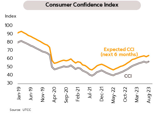 การบริโภคภาคเอกชนอาจได้แรงหนุนจากการปรับดีขึ้นของความเชื่อมั่นผู้บริโภคและมาตรการบรรเทาค่าครองชีพจากภาครัฐ โดยดัชนีความเชื่อมั่นผู้บริโภคเดือนสิงหาคมกลับมาปรับตัวขึ้นสู่ระดับ 56.9 จากเดือนกรกฎาคมซึ่งปรับตัวลดลงเป็นครั้งแรกในรอบ 14 เดือน ที่ 55.6 ปัจจัยบวกจากการจัดตั้งรัฐบาลที่มีความชัดเจนซึ่งจะช่วยทำให้มีการเดินหน้าด้านนโยบายเพื่อขับเคลื่อนเศรษฐกิจให้ฟื้นตัว