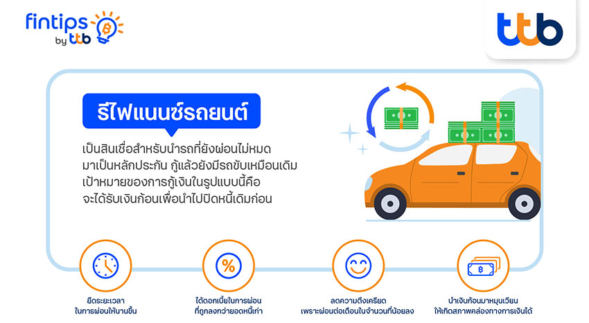 รีไฟแนนซ์รถยนต์ คือ สินเชื่อทางเลือกสำหรับคนที่มีรถแต่ยังผ่อนไม่หมด แม้จะมีภาระผูกพันทางการเงิน แต่สินเชื่อประเภทนี้ช่วยให้ผู้กู้สามารถใช้รถยนต์เป็นหลักประกันในการกู้ได้ แต่ก็ยังสามารถนำรถยนต์ไปใช้ได้ตามปกติ ซึ่งประโยชน์ที่นำไปใช้จากเงินก้อนนี้ ได้แก่ ช่วยขยายระยะเวลาการผ่อนคืนได้นานขึ้น อัตราดอกเบี้ยในการผ่อนชำระที่ลดลงเมื่อเทียบกับหนี้เดิม และที่สำคัญช่วยคลายความเครียดจากภาระการผ่อนรายเดือน รวมทั้งหากมีเงินส่วนต่างเหลือยังสามารถนำไปจัดสรรเพื่อเพิ่มสภาพคล่องทางการเงินได้
