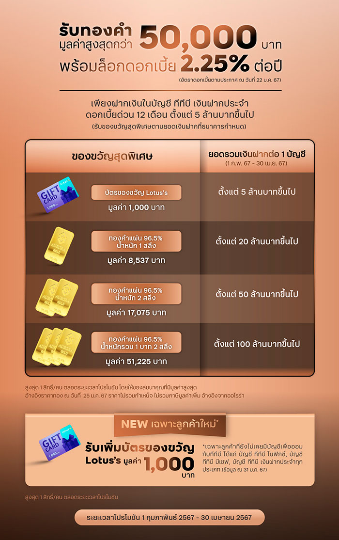 พิเศษสำหรับลูกค้าใหม่ เมื่อฝากเงินกับบัญชี ทีทีบี เงินฝากประจำดอกเบี้ยด่วน 12 เดือน ตั้งแต่ 5 ล้านขึ้นไป รับเพิ่มบัตรของขวัญโลตัส มูลค่า 1,000 บาท (ลูกค้าใหม่ คือ ลูกค้าที่ยังไม่เคยมีบัญชีเพื่อออมของธนาคาร ได้แก่ บัญชี ทีทีบี โนฟิกซ์, บัญชี ทีทีบี มีเซฟ, บัญชี ทีทีบี เงินฝากประจำทุกประเภท อ้างอิง ข้อมูล ณ วันที่ 31 มกราคม 2567)