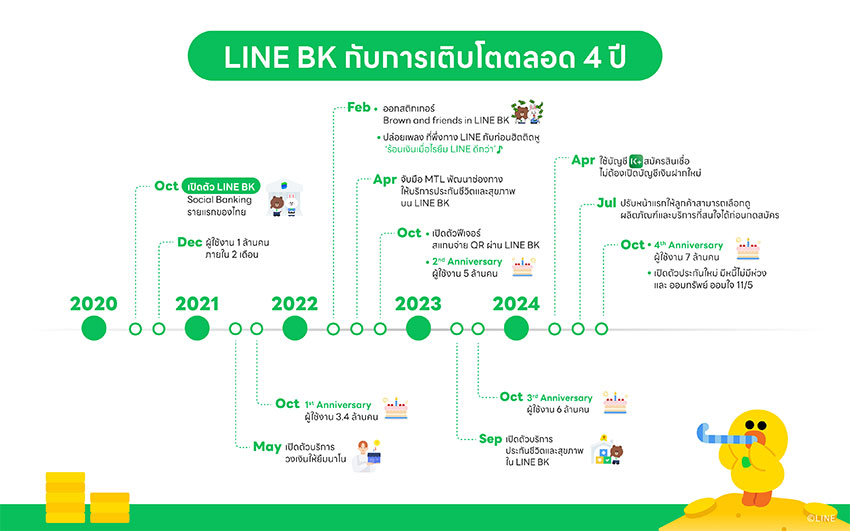LINE BK ผู้นำด้าน Social Banking ของไทย ฉลองครบรอบ 4 ปีแห่งความสำเร็จ พร้อมก้าวเข้าสู่ปีที่ 5 ด้วยความมุ่งมั่นที่จะพลิกโฉมบริการทางการเงินดิจิทัลที่เข้าถึงง่ายและครอบคลุมทุกความต้องการของคนไทย ไม่ว่าจะเป็นการฝาก ถอน โอน ยืม หรือซื้อประกัน ทั้งหมดนี้รวมอยู่ในแอปพลิเคชัน LINE อย่างครบครัน โดยมีผู้ไว้วางใจใช้งานทุกบริการรวมกว่า 7 ล้านคนทั่วประเทศ ด้านบริการยืมเงินยังเป็นบริการหลักที่ช่วยเหลือคนไทยในทุกช่วงเวลาสำคัญ ปัจจุบันให้วงเงินลูกค้ากว่า 7 แสนคน มียอดสินเชื่อคงค้างกว่า 21,000 ล้านบาท ภายใต้นโยบายปล่อยสินเชื่ออย่างมีความรับผิดชอบและการบริหารพอร์ทหนี้เสียที่ดี