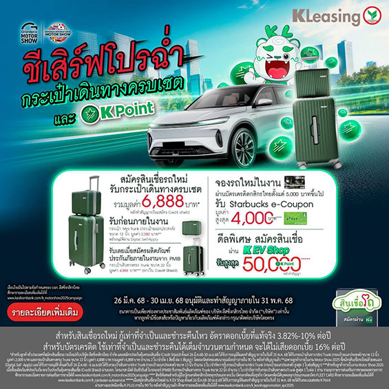 เงื่อนไขเป็นไปตามที่ธนาคารและบจก. ลีสซิ่งกสิกรไทยกำหนด ศึกษารายละเอียดเพิ่มเติมได้ที่ www.kasikornbank.com/k_motorshow2025campaign