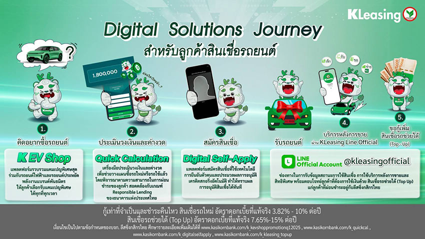 ทั้งนี้ ลูกค้าที่สนใจสามารถสมัครใช้บริการได้ที่เว็บไซต์ www.kasikornbank.com/k_ok หรือแอดไลน์ เพิ่มเพื่อน @kleasingofficial คลิกเมนู K OK