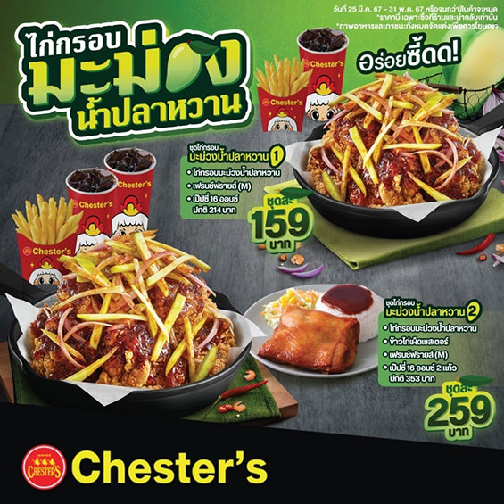 กลับมาตามคำเรียงร้อง! เชสเตอร์ (Chester’s) เสิร์ฟเมนูสุดแซ่บเอาใจชาวด้อมมะม่วงน้ำปลาหวาน กับเมนู ‘ไก่กรอบมะม่วงน้ำปลาหวาน’ เปลี่ยนซัมเมอร์สุดฮอต... ให้สุดซี้ด ด้วยไก่ทอดกรอบๆ เนื้อเน้นๆ ไร้กระดูก ท็อปปิ้งกับมะม่วงน้ำดอกไม้ดิบกรอบอร่อย รสหวานอมเปรี้ยว ราดด้วยซอสน้ำปลาหวานรสเผ็ดแซ่บ หอมอร่อยกลมกล่อม ในราคา 125 บาท พิเศษจำหน่ายเฉพาะหน้าร้อนนี้เท่านั้น!