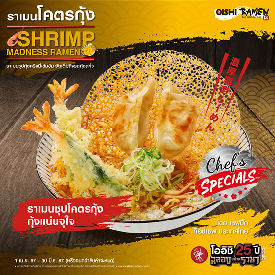 สัมผัสประสบการณ์ โอ-ร่อย ผ่านอาหารจานพิเศษ ราเมนสูตรแชมป์เปี้ยน...ราเมนโคตรกุ้ง แบบฉบับท็อปเชฟ ภายใต้แคมเปญ โออิชิ 25 ปี ฉลองอย่างราชา ได้แล้ววันนี้ ที่ โออิชิ ราเมน ทุกสาขา วันนี้ถึง 30 มิถุนายน 2567 หรือจนกว่าสินค้าจะหมด ติดตามข้อมูลข่าวสารเพิ่มเติม คลิกแฟนเพจโออิชิฟู้ดสเตชั่น : FACEBOOK.COM/OISHIFOODSTATION หรือค้นหา โออิชิ ราเมน สาขาใกล้ ๆ คุณ คลิกเว็บไซต์โออิชิฟู้ด : OISHIFOOD.COM
