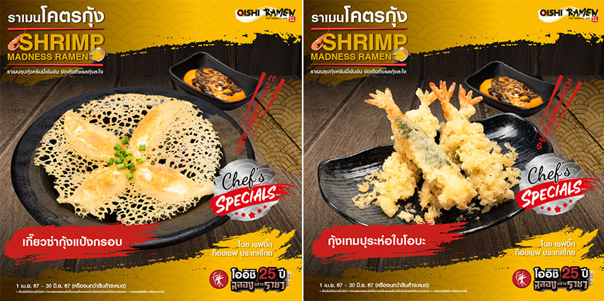 อิ่ม โอ-ร่อย เมนูใหม่ในธีม “Touch of Japanese Flavor” ขอแนะนำอาหารจานพิเศษ ราเมนสูตรแชมป์เปี้ยน...ราเมนโคตรกุ้ง แบบฉบับ เชฟบิ๊ก ท็อปเชฟ ประเทศไทย มาแล้วต้องสั่ง เมนู “ราเมนซุปโคตรกุ้ง...กุ้งแน่นจุใจ” เสิร์ฟทีเด็ด ราเมน เส้นเหนียวนุ่ม เป็นเอกลักษณ์ มากับน้ำซุปกุ้ง...สูตรพิเศษ เติมโนริครีม เพิ่มรสสัมผัสเข้มข้น กลมกล่อม ในทุกคำ พร้อมด้วยเกี๊ยวซ่าแป้งกรอบ ไส้กุ้งแน่น ๆ และกุ้งเทมปุระห่อใบโอบะชิ้นโต กรอบ...เต็มคำ ราคาชามละ 229 บาท (หรือเลือกสั่งเป็น “ราเมนซุปโคตรกุ้ง” (ไม่มีกุ้งเทมปุระห่อใบโอบะ) ราคาชามละ 189 บาท) นอกจากนี้ ยังมีของว่างและอาหารรับประทานเล่น พลาดไม่ได้ ทั้ง เมนู “เกี๊ยวซ่ากุ้งแป้งกรอบ” เกี๊ยวซ่าแป้งกรอบ ไส้กุ้งแน่น ๆ เสิร์ฟมากับซอสสไปซี่โนริ...เผ็ดเล็กน้อย ราคาจานละ 99 บาท และ เมนู “กุ้งเทมปุระห่อใบโอบะ” กุ้งเทมปุระกรอบ ๆ ชิ้นโต ห่อด้วยใบโอบะ ช่วยเพิ่มมิติและรสชาติที่ดี เสิร์ฟมากับซอสสไปซี่โนริ...เผ็ดเล็กน้อย ราคาจานละ 139 บาท