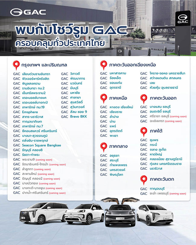 เดินหน้าขยายเครือข่ายบริการเพื่อความอุ่นใจทั่วประเทศ: ปัจจุบัน GAC ประเทศไทย มีศูนย์บริการและโชว์รูมที่เปิดให้บริการแล้ว กว่า 50 แห่ง ในพื้นที่ยุทธศาสตร์ทั่วประเทศไทย และเพื่อสร้างความเชื่อมั่นและอำนวยความสะดวกสบายให้แก่ลูกค้าที่เพิ่มขึ้นอย่างต่อเนื่อง บริษัทฯ มีแผนที่จะขยายเครือข่ายให้ครอบคลุมกว่า 80 แห่งทั่วประเทศภายในปี 2569 เพื่อให้การบริการทั้งด้านการขายและหลังการขายเป็นไปอย่างทั่วถึงและมีประสิทธิภาพสูงสุด
