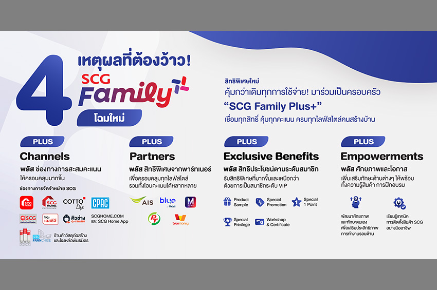 SCG Family Plus+ โฉมใหม่มาพร้อมจุดเด่นด้านความสะดวก คุ้มค่า และครอบคลุมกว่า โดยรวบรวมทุกระบบสมาชิกสะสมคะแนนของเครือเอสซีจีมาไว้ในครอบครัวเดียวกัน ทั้งสินค้าและช่องทางจัดจำหน่าย ไม่ว่าจะเป็นสินค้ากลุ่มปูนซีเมนต์ คอนกรีตผสมเสร็จ หรือวัสดุก่อสร้างต่างๆ ตลอดจนช่องทางร้านผู้แทนจำหน่ายของเอสซีจีและกลุ่มพันธมิตรโดยตั้งเป้าขยายให้ครอบคลุมมากกว่า 1,000 ช่องทางทั่วประเทศ เพื่อให้ลูกค้าทุกกลุ่ม ตั้งแต่เจ้าของบ้าน ช่าง ไปจนถึงผู้รับเหมารายย่อย สามารถสะสมคะแนนได้ง่ายและใช้ประโยชน์ได้เต็มมูลค่าทุกการซื้อ