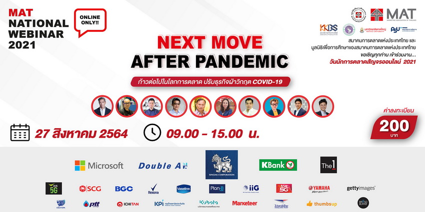 การสัมมนา “MAT National Webinar 2021 : Next Move After Pandemic” จัดให้มีขึ้นวันศุกร์ที่ 27 สิงหาคม 2564 เวลา 9.00 -15.00 น. ผู้สนใจเข้าร่วมงาน สามารถลงทะเบียนออนไลน์ได้ที่ https://www.marketingthai.or.th/event/mat-national-webinar-2021 โดยมีค่าใช้จ่ายในการลงทะเบียนเพียง 200 บาทเท่านั้น หรือสอบถามรายละเอียดเพิ่มเติมที่สมาคมการตลาดแห่งประเทศไทย โทร 02-679-7360-3 หรือ Line ID: @matsociety