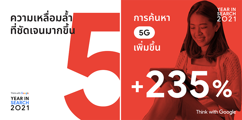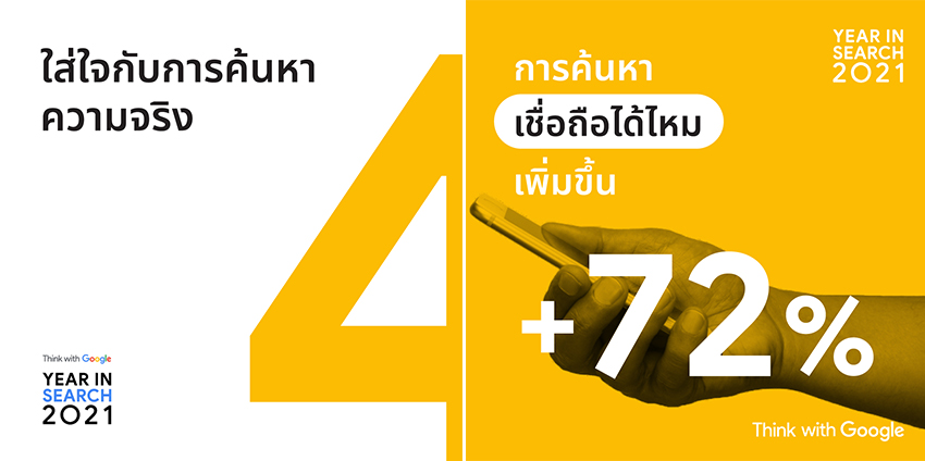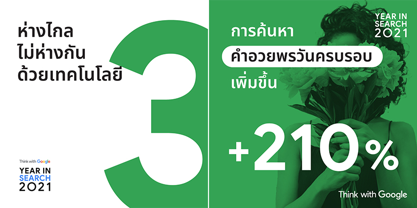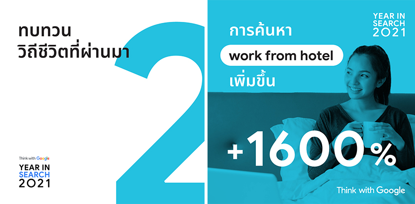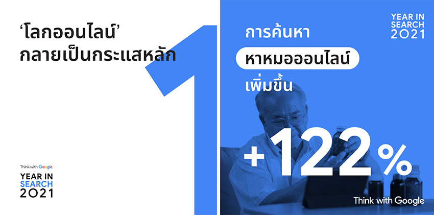 Google ประเทศไทย เผยข้อมูลเชิงลึกจากการค้นหาของผู้บริโภคตลอดทั้งปีจากรายงาน Year in Search ของประเทศไทย ประจำปี 2021 (Year in Search 2021 - Thailand report) เพื่อสร้างโอกาสและช่วยต่อยอดทางธุรกิจสำหรับแบรนด์และกลุ่มธุรกิจหลักในปี 2022 จากสถานการณ์โควิด-19 แสดงให้เห็นถึงการที่ผู้คนยอมรับเพื่อให้สามารถอยู่ร่วมกับความไม่แน่นอนได้ ปี 2020 เป็นปีที่ผู้คนหันมาใช้เทคโนโลยีดิจิทัลกันมากขึ้น และปี 2021 ยังคงแสดงให้เห็นว่าพฤติกรรมของผู้บริโภคได้เปลี่ยนไปอย่างถาวรไม่ว่าจะเป็นการใช้ชีวิตแบบผสมผสาน การจับจ่ายซื้อของ การทำงาน การเงิน และการตรวจสอบข้อเท็จจริง ทำให้ปัจจุบันดิจิทัลกลายเป็นส่วนหนึ่งของชีวิตประจำวันของผู้คน รวมทั้งพวกเขายังมีความเชี่ยวชาญในการใช้ประโยชน์จากการเข้าถึงอินเทอร์เน็ตเพื่อให้มีข้อมูลและช่วยในการตัดสินใจได้ดีขึ้น
