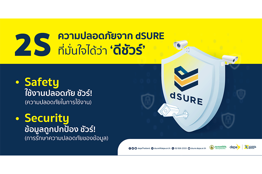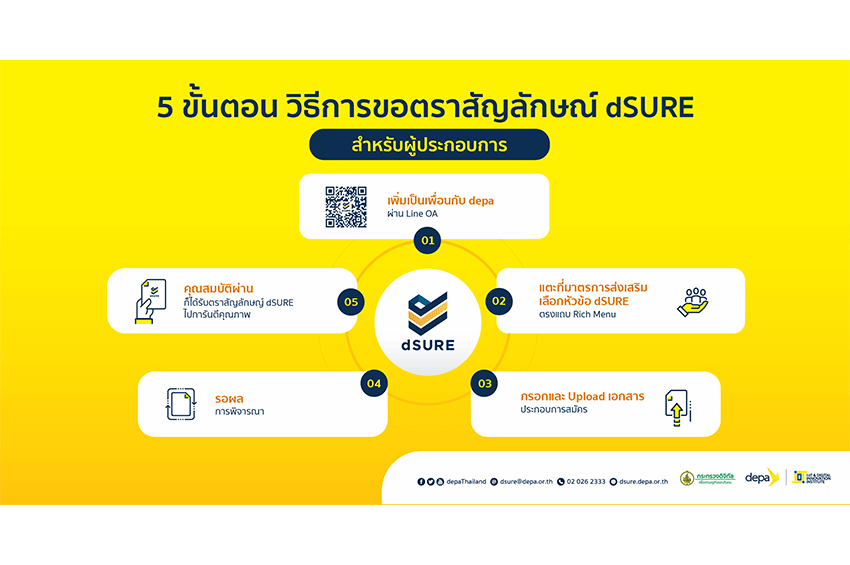 ทั้งนี้ ดีป้า เปิดให้ผู้ประกอบการไทยขอรับตราลักษณ์ dSURE ได้แล้ววันนี้ ซึ่งผู้สนใจสามารถศึกษาขั้นตอน* และคุณสมบัติของผู้ประกอบการ เพื่อขอรับตราสัญลักษณ์ dSURE ได้ที่ LINE Official Account: @depaThailand หรือ https://dsure.depa.or.th/