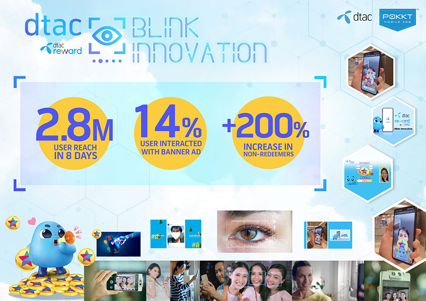 - Blink ad innovation ในโฆษณาดีแทค รีวอร์ด สื่อแบนเนอร์โฆษณาแบบ interactive เพียงกระพริบตา ก็จะเข้าสู่ข้อมูลในเว็บไซต์ดีแทค รีวอร์ด มีผู้เห็น (user reached) 2.8 ล้านรายในเวลาเพียง 8 วัน มีผู้ใช้งานผ่านแบนเนอร์ 14% (user interacted) มีการแลกรับสิทธิพิเศษมากขึ้น 200% ในกลุ่มใหม่ที่ไม่เคยใช้สิทธิ์ ดีแทค รีวอร์ด Blink ad innovation ได้รับรางวัล Bronze: การใช้สื่อยุคใหม่ที่สร้างสรรค์ยอดเยี่ยม (Media innovation)