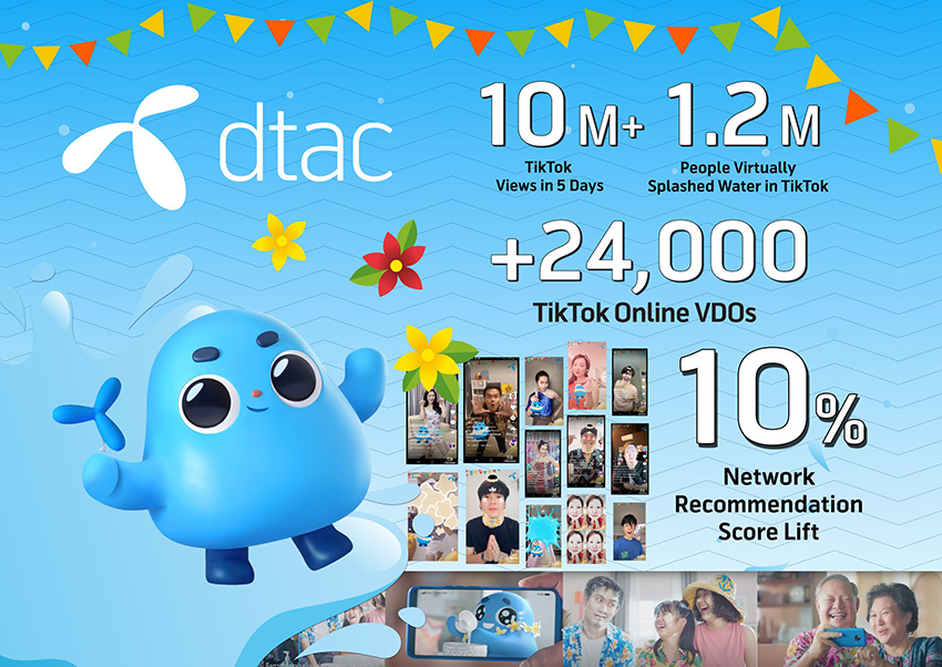 - ดีแทคร่วมกับ Tik Tok สร้างชิ้นงาน animation ประแป้งแต่งตัว เล่นน้ำสงกรานต์ออนไลน์กับน้องตัวดี เพื่อสร้างความสนุกสนานที่สอดรับกับพฤติกรรมกับความนิยมในการโพสต์วิดีโอใหม่ๆใน Tik Tok ที่เป็นกิจกรรมผ่อนคลายความเครียดจากการกักตัวที่กำลังมาแรงในช่วงนั้น มีคนเห็นวิดีโอ 10 ล้าน view ในเวลาเพียง 5 วัน มีคนเล่นสาดน้ำ 1.2 ล้านคน สร้างการบอกต่อเรื่องสัญญาณการใช้งานเพิ่มขึ้น 10% ดีแทคสงกรานต์ใน Tik Tok ได้รับรางวัล Bronze : การใช้แบรนด์คอนเท้นต์ยอดเยี่ยม (Best use of branded content)