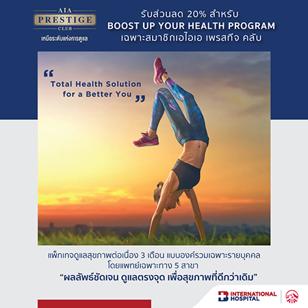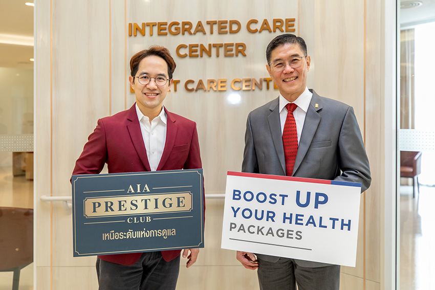 เอไอเอ ประเทศไทย ร่วมกับ โรงพยาบาลกรุงเทพอินเตอร์เนชั่นแนล จัดแพ็กเกจตรวจสุขภาพ Boost Up Your Health : Total Health Solution for a Better You ดูแลสุขภาพให้ตรงจุด บูสคุณภาพชีวิตให้ดีกว่าเดิม โดยศูนย์การรักษาแบบบูรณาการองค์รวม (Integrated Care Center) โรงพยาบาลกรุงเทพอินเตอร์เนชั่นแนล ในราคาพิเศษเพื่อมอบสิทธิพิเศษให้กับสมาชิกโครงการ AIA Prestige Club สำหรับแพ็กเกจการดูแลสุขภาพแบบองค์รวมเฉพาะรายบุคคลนี้ จะได้รับการดูแลจากแพทย์เฉพาะทางที่มีให้เลือกถึง 5 สาขา เพื่อส่งเสริมให้สมาชิกโครงการ AIA Prestige Club มีสุขภาพและชีวิตที่ดีขึ้น