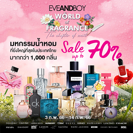 จัด “EVEANDBOY World of Fragrance The Chapter of Scent” มหกรรมน้ำหอมสุดยิ่งใหญ่แห่งปี ยกทัพน้ำหอมแบรนด์ดังระดับโลกมากมาย และน้ำหอมแบรนด์ไทยตัวท็อปรวมกันมากกว่า 1,000 กลิ่น มาให้ช็อปกันแบบจัดเต็ม ลดสูงสุดถึง 70% อาทิ YVES SAINT LAUREN,BURBERRY FRAGRANCE, CALVIN KLEIN, GIORGIO ARMANI, CHOLE, GUCCI, PRADA, ISSEY MIYAKE, BILLIE EILISH, DIESEL,GUCCI ฯลฯ