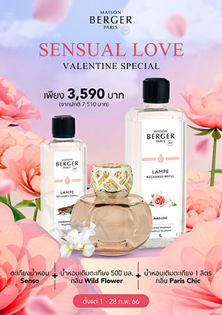 ชุด Sensual Love ตะเกียงน้ำหอม Senso มาคู่กับน้ำหอมกลิ่น Wild Flower ขนาด 500 มิลลิลิตร พร้อมด้วยน้ำหอมเติมตะเกียงกลิ่น Paris Chic ขนาด 1,000 มิลลิลิตร 1 ขวด จำหน่ายราคาชุดละ 3,590 บาท