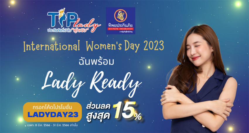 โดย บริษัท ทิพยประกันภัย จำกัด (มหาชน) ในปี 2566 นี้ ได้จัด แคมเปญ “#LadyReady ฉันพร้อม” เพราะปัจจุบันโลกมีการเปลี่ยนแปลงไปอย่างรวดเร็ว ผู้หญิงก็เข้ามามีส่วนร่วมและมีบทบาทมากขึ้น ทั้งการเป็นผู้นำและผู้สร้างแรงบันดาลใจ วันสตรีสากล เป็นวันที่ทั่วโลกร่วมรำลึกถึงสิทธิสตรี และให้ความสำคัญกับความเท่าเทียม ความเสมอภาคทางเพศ โดยแคมเปญ “#LadyReady ฉันพร้อม” ต้องการปลุกพลังและผลักดันให้ผู้หญิงทุกคนสร้างความมั่นใจให้กับตนเอง พร้อมตั้งเป้าหมายให้ผู้หญิงเริ่มต้นทำในสิ่งที่ต้องการ ในเวอร์ชันที่ตัวเองภูมิใจ เพื่อช่วยสร้างพลังอันยิ่งใหญ่ให้ผู้หญิงทุกคน